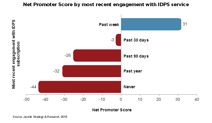 The new report finds that successfully building long-term relationships with subscribers requires establishing awareness of the product benefits, providing a robust set of useful capabilities, and consistently engaging with subscribers. Frequent engagement is an important driver of satisfaction. Individuals who interacted with their IDPS subscription within the last week gave their subscription a Net Promoter Score (NPS) of 31, while subscribers whose most recent interaction was more than a week ago gave their subscriptions negative NPS.
