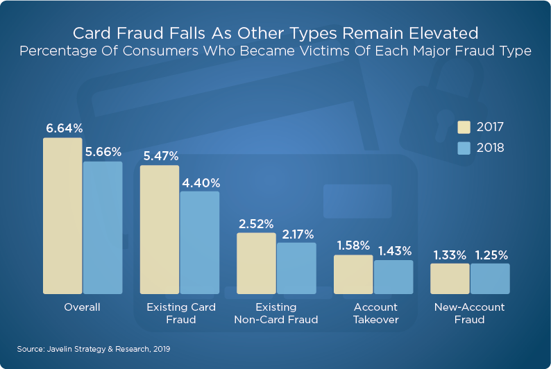 The study found that overall fraud incidence and fraud losses declined in 2018, from 6.64% to 5.66% and from $16.8 billion to $14.7 billion, respectively. The occurrence and losses due to account takeover decreased year-over-year from 1.58% to 1.43% and from $5.1 billion to $4.0 billion, although levels remained much higher than prior years.