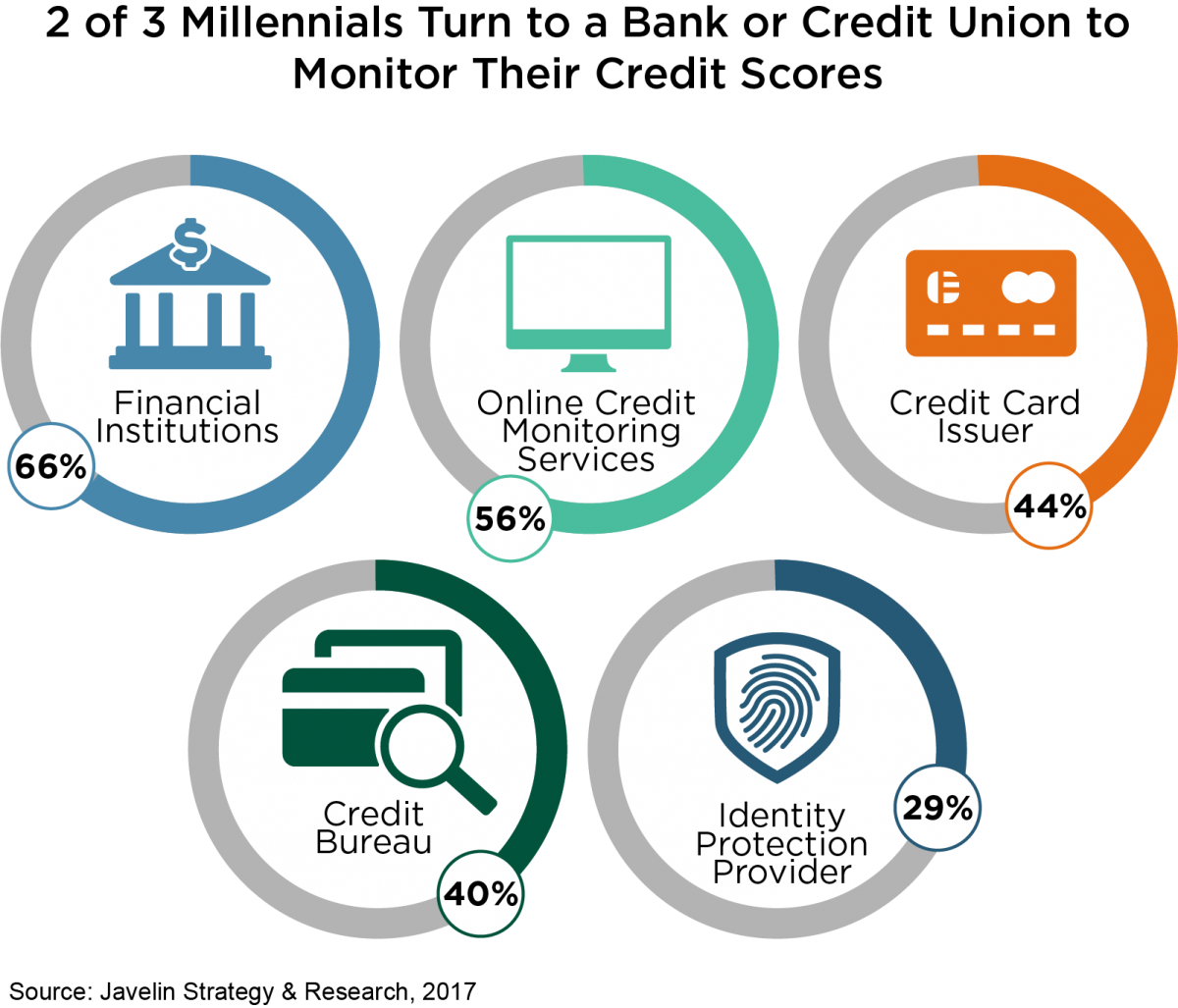 San Francisco, CA, December 5, 2017: Many Americans monitor their credit score at a bank or credit union rather than through online apps. Among Millennials this is especially true as 2 in 3 monitor their score at their FI vs. about half use a non-bank online service or mobile app.