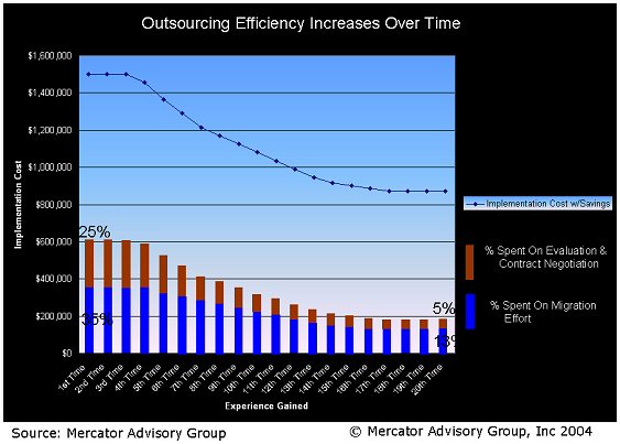 The report "Business Process Outsourcing in Financial Institutions Enters A New Phase" identifies how successful Tier 1 and Tier 2 financial institutions are turning the outsourcing process itself into a core competency. These firms develop a common way to document processes and engage BPO service providers, while also building IT infrastructure that supports rapid and multiple BPO implementations. By establishing a team that integrates finance, IT, and operational units, financial institutions can reduce the costs associated with outsourcing by almost 50%. This reduction is possible by streamlining how business processes are documented and cost justified as an outsourced opportunity, through the development of appropriate financial tools that reduce the cost of pricing and contract negotiations, and by reducing costs associated with migrating applications to the remote location, including systems, software and process knowledge.